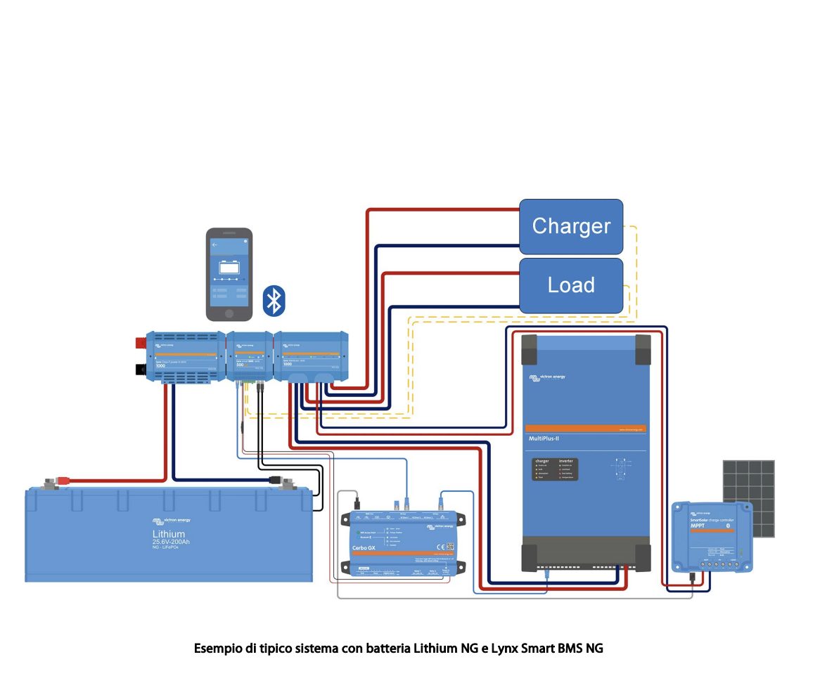 Tutti i parametri della batteria sono gestiti automaticamente dal BMS. Il BMS rileva automaticamente la tensione del sistema e il numero di batterie in parallelo, in serie e in serie/parallelo. Il BMS (da ora in avanti Lynx Smart BMS NG 500 A/1000 A, seguiranno altri modelli) è obbligatorio e deve essere acquistato separatamente.
