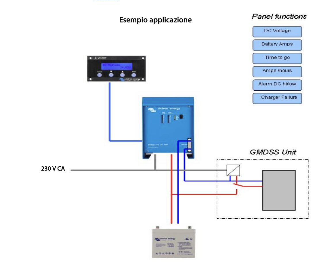 Il caricabatterie Skylla GMDSS di Victron è stato progettato per fornire tutti i dati di allarmi e monitoraggio richiesti. Sia la batteria che il sistema GMDSS sono collegati direttamente al caricabatterie. I dati e gli allarmi sono tutti visualizzati su un pannello digitale (pannello VE.Net GMDSS, da ordinare separatamente). Un cavo di rete UTP standard a otto fili collega caricabatterie e pannello.