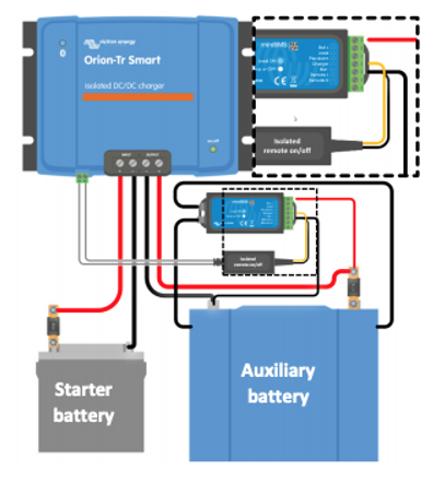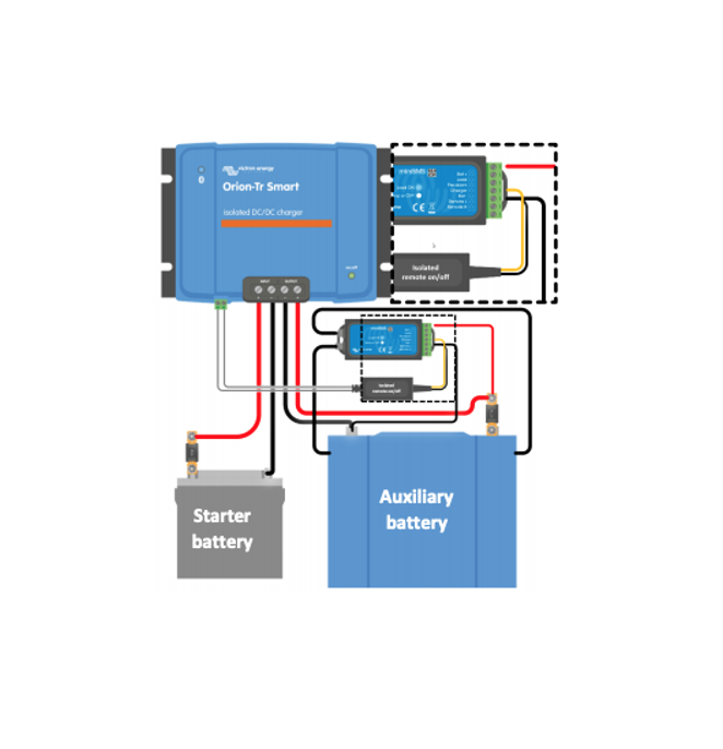 Nei caricabatterie CC-CC isolati Orion-Tr il circuito di accensione / spegnimento remoto è riferito alla batteria primaria (es. batteria avviamento). L’Orion-Tr isolato Il cavo remoto del caricabatterie CC-CC è progettato per applicazioni in cui il telecomando il segnale di accensione / spegnimento è riferito alla batteria secondaria (es. batteria al litio con BMS).