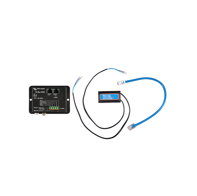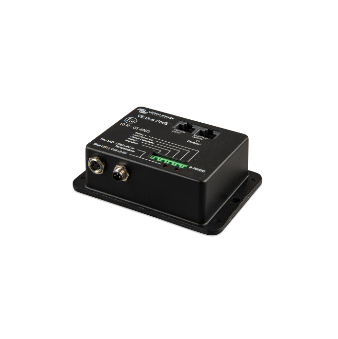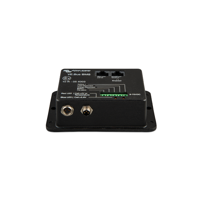 Ogni singola cella di una batteria LiFePO4 deve essere protetta da sovratensione, sottotensione e sovratemperatura. Le batterie Victron LiFePO4 dispongono di controllo di equalizzazione, temperatura e tensione (acronimo: BTV, Balancing, Temperature and Voltage) e si connettono al BMS VE.Bus con due set di cavi per connettori circolari M8. I BTV di diverse batterie possono essere collegati in daisy-chain. È possibile collegare fino a cinque batterie in parallelo e fino a quattro batterie in serie (le BTV sono semplicemente collegate in daisy-chain), in modo da poter assemblare un banco batterie da 48V fino a 1500Ah. Per ulteriori dettagli, si prega di consultare la documentazione della batteria LiFePO4. Il BMS: