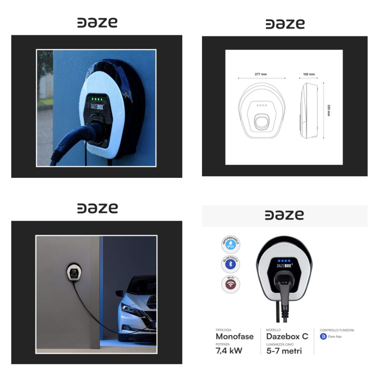 Daze Dazebox C è una wallbox monofase da 7,4kW di potenza, ideale per una ricarica semplice e veloce della propria auto elettrica. È dotata di 4 LED multicolore per indicare lo stato della carica ed è equipaggiata con un cavo di Tipo 2 per assicurare la massima compatibilità con veicoli elettrici e plug-in hybrid di tutte le principali case automobilistiche. Predisposta per l’installazione a parete, può essere monitorata e controllata da remoto tramite l’app di Daze (disponibile per Android ed iOS) grazie alla sua connettività Wi-Fi e Bluetooth. L’applicazione permette inoltre di condividere l’utilizzo dei caricatori, di gestire le autorizzazioni alla ricarica e di visionare la reportistica dei consumi. Grazie al sistema Solar Boost sfrutta al massimo l’energia prodotta dall’impianto fotovoltaico, e con la funzionalità Power Sharing permette di installare un ampio numero di caricatori su un unico impianto, impostando il limite massimo di potenza totale erogabile per non superare la capacità del contatore. Inoltre, grazie al suo livello di resistenza meccanica IK08 ed al suo grado di protezione IP55 risulta ideale per un utilizzo esterno, al riparo dalla pioggia prolungata. Garantisce un’integrazione perfetta con qualsiasi impianto fotovoltaico monofase grazie al modulo DPM (non incluso). Grazie al sistema di bilanciamento dei carichi o Dynamic Power Management, infatti, la wallbox monitora attivamente le utenze della casa, erogando al veicolo sempre la massima potenza disponibile per una ricarica più rapida senza mai però superare i limiti di consumo. Disegnata, progettata e prodotta in Italia.