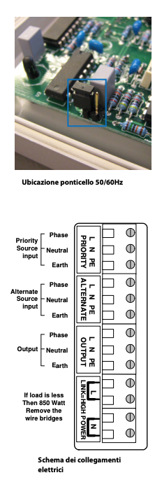 • La frequenza (50Hz o 60Hz) viene impostata tramite un ponticello. 50Hz nessun ponticello installato. 60Hz ponticello in posizione (cfr. foto)