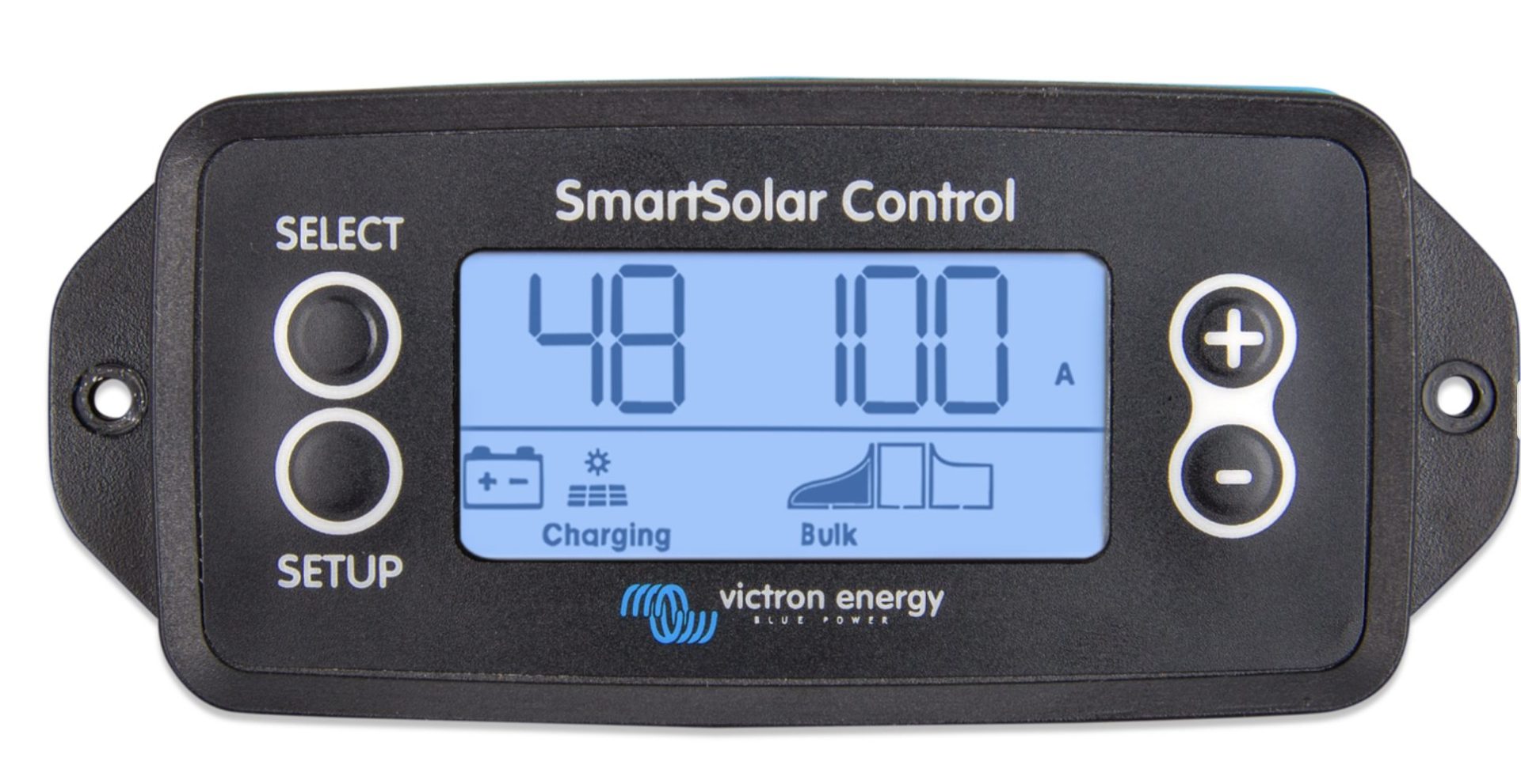 Il display SmartSolar Control è un display LCD a spina per i regolatori di carica SmartSolar.
