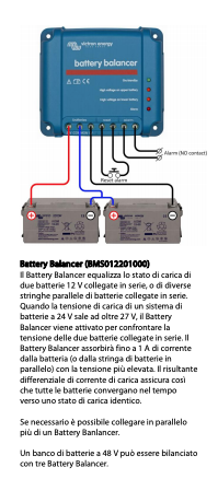Si raccomanda l’uso del nostro Battery Balancer (BMS012201000) per prolungare al massimo la vita utile di servizio delle batterie collegate in serie.