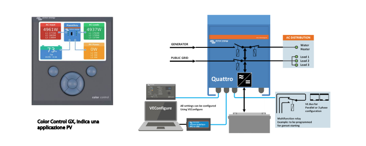 – Le applicazioni fuori rete, con rete interattiva e di autoconsumo, con inverter collegati alla rete e/o Caricabatterie Solari MPPT, possono essere configurate con Assistant (software dedicato per applicazioni specifiche).