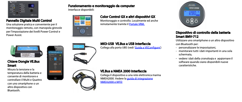 Sono disponibili diverse interfacce: Battery Monitor, Color Control GX e altri dispositivi GX, pannello Color Control, smartphone o tablet (Bluetooth Smart), computer portatile o PC (USB o RS232).