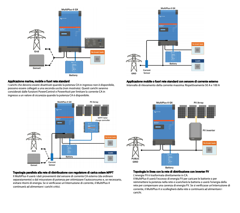 Essendo un Inverter/Caricabatterie con dispositivo di rete integrato, il MultiPlus-II GX comunica con un caricabatterie solare, le batterie ed altri dispositivi, per controllare un impianto elettrico collegato alla rete, isolato o remoto. Potendo operare in parallelo, per una maggior uscita, o in regime di carica, il MultiPlus-II GX può anche essere configurato per l’alimentazione trifase.
