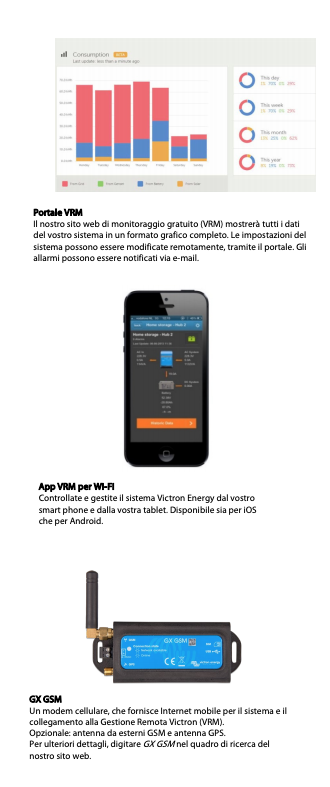 Il MultiPlus-II GX è indicato nei casi in cui sia necessaria un’interfaccia con altri prodotti e/o il monitoraggio remoto, come per i sistemi di accumulo dell’energia in rete e isolati e per determinate applicazioni mobili.