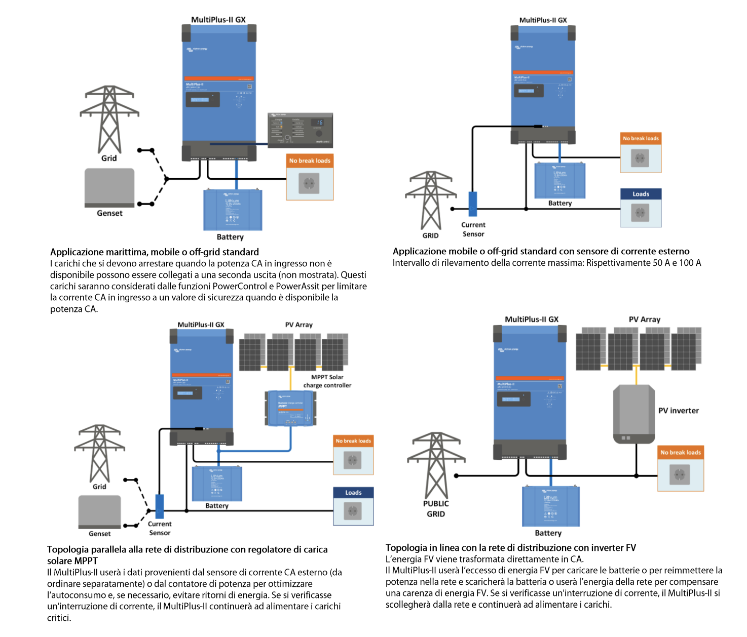 Essendo un Inverter/Caricabatterie con dispositivo di rete integrato, il MultiPlus-II GX comunica con un caricabatterie solare, le batterie ed altri dispositivi, per controllare un impianto elettrico collegato alla rete, isolato o remoto. Potendo operare in parallelo, per una maggior uscita, o in regime di carica, il MultiPlus-II GX può anche essere configurato per l’alimentazione trifase.