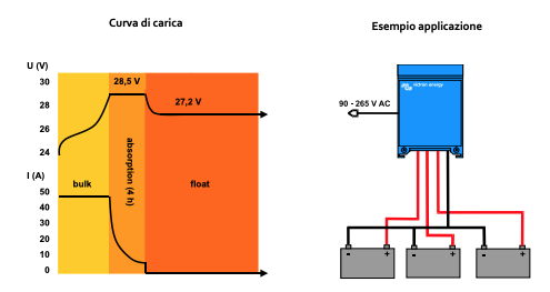 - Per ciclo di carica e taratura carica batteria, vedere schede tecniche batterie.