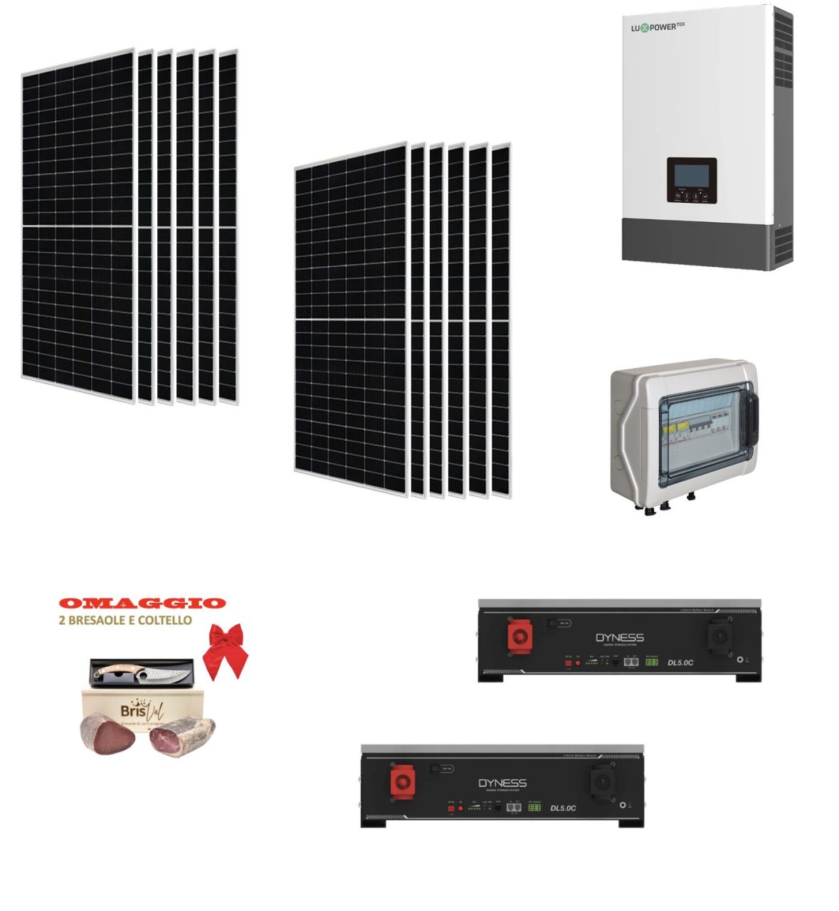 Kit Off grid autoconsumo 5Kwp Pannello Solare TRINA SOLAR 500Wp Monocristallino Inverter 6Kwh regolatore 2 ingressi + Batterie litio Dyness 200Ah 10Kwh