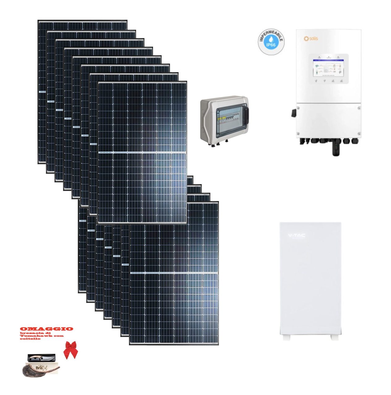 Kit OFF/ON GRID 8Kwp Autoconsumo MONOFASE Pannello Solare TONGWEI Bifacciale 500Wp Inverter 6Kwh SOLIS IP65 con regolatore + Batteria litio 10KWh