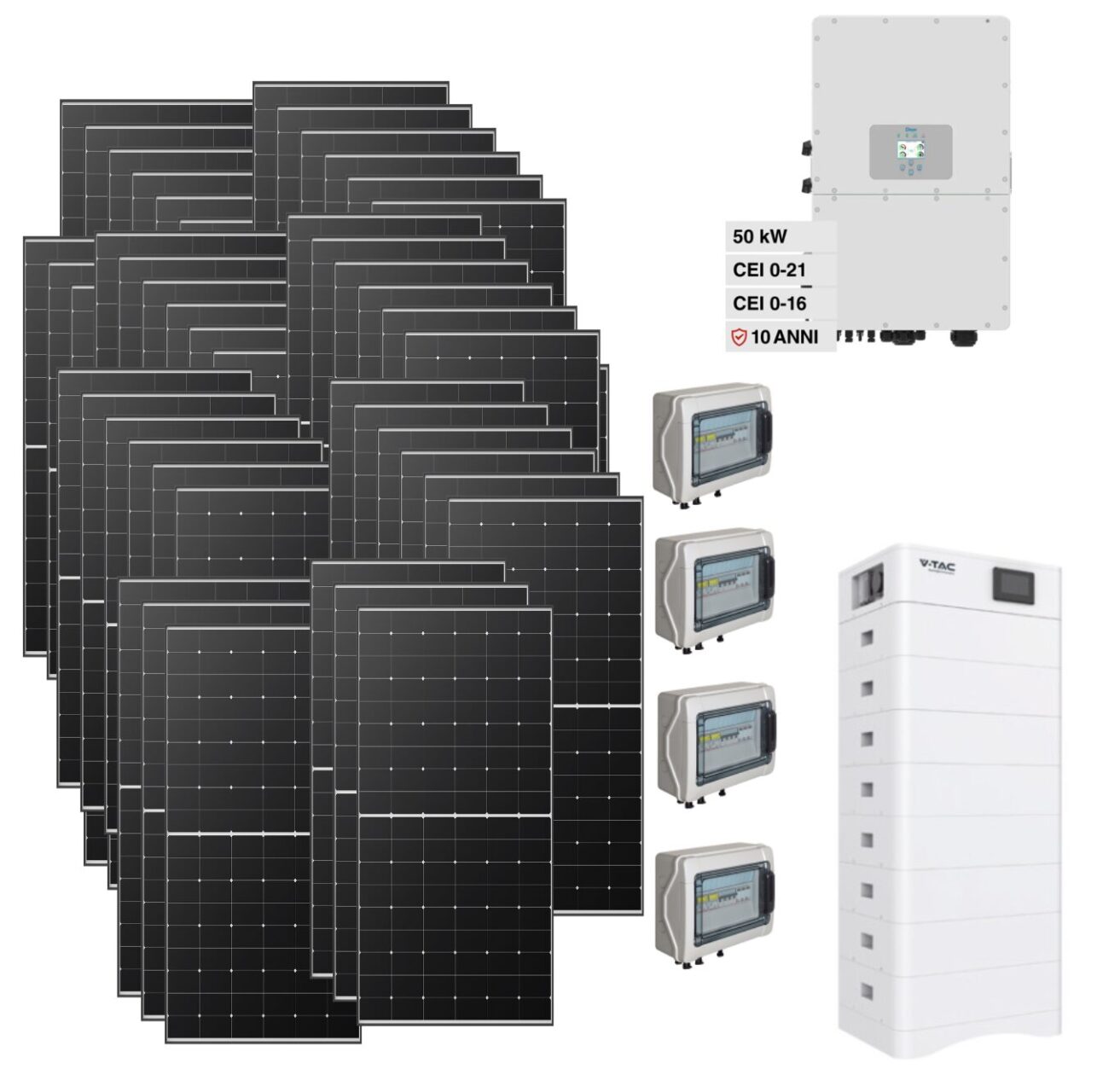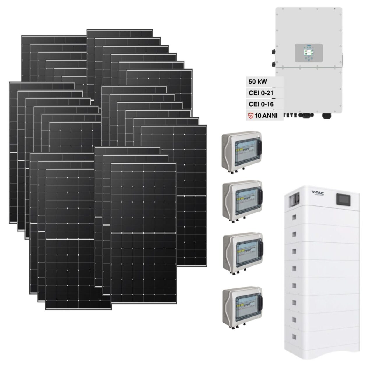 Kit OFF/ON GRID CEI021 Autoconsumo TRIFASE 58Kwp Pannello Solare Longi 610Wp Wp Bifacciale Inverter 50Kwh DEYE con regolatore + Batteria litio 40Kwh 800Ah