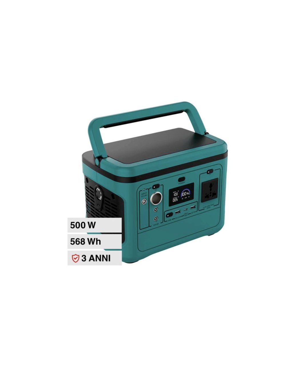 Accumulatore portatile al Litio con capacità di 568Wh. Potenza di 500W con output massimo di 1000W. Ricaricabile tramite rete elettrica o pannello solare fotovoltaico portatile