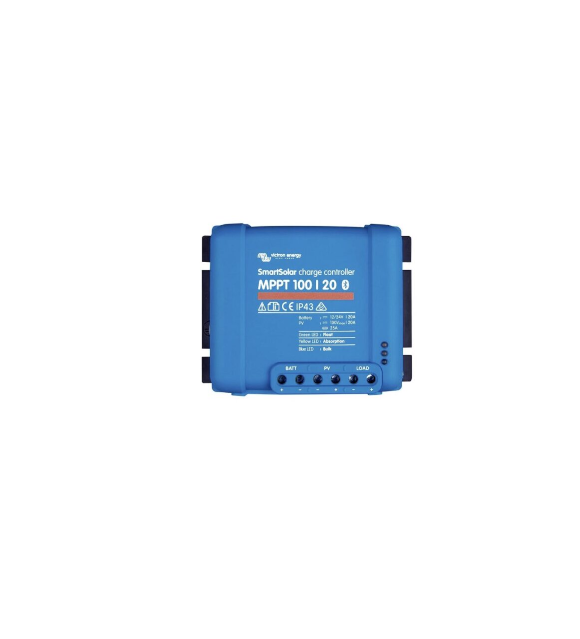 01 regolatore di carica solare Victron Energy Smart MPPT 100/20 con modulo Bluetooth, uscita di carico e ampie opzioni di configurazione.