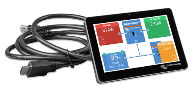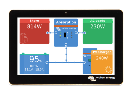 è l’accessorio display per il nostro Cerbo GX . Il display touch screen da cinque pollici offre una panoramica istantanea del sistema e consente di regolare le impostazioni in un batter d’occhio. Collegato semplicemente al Cerbo GX con un cavo, il suo design impermeabile super sottile, la configurazione con montaggio dall’alto e la sua semplice installazione offrono molta flessibilità durante la creazione di un cruscotto nitido e pulito.