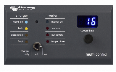 Il Multi Control Digitale si utilizza per vedere e regolare remotamente le correnti di ingresso in AC e per accendere e spegnere i Multi o i Quattro. È progettato per integrarsi perfettamente nel pannello di controllo di barche, veicoli o case.