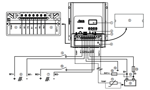 Interfaccia di comunicazione, display LCD, display LCD, doppio MPPT tracker, sensore di temperatura PA TS-S