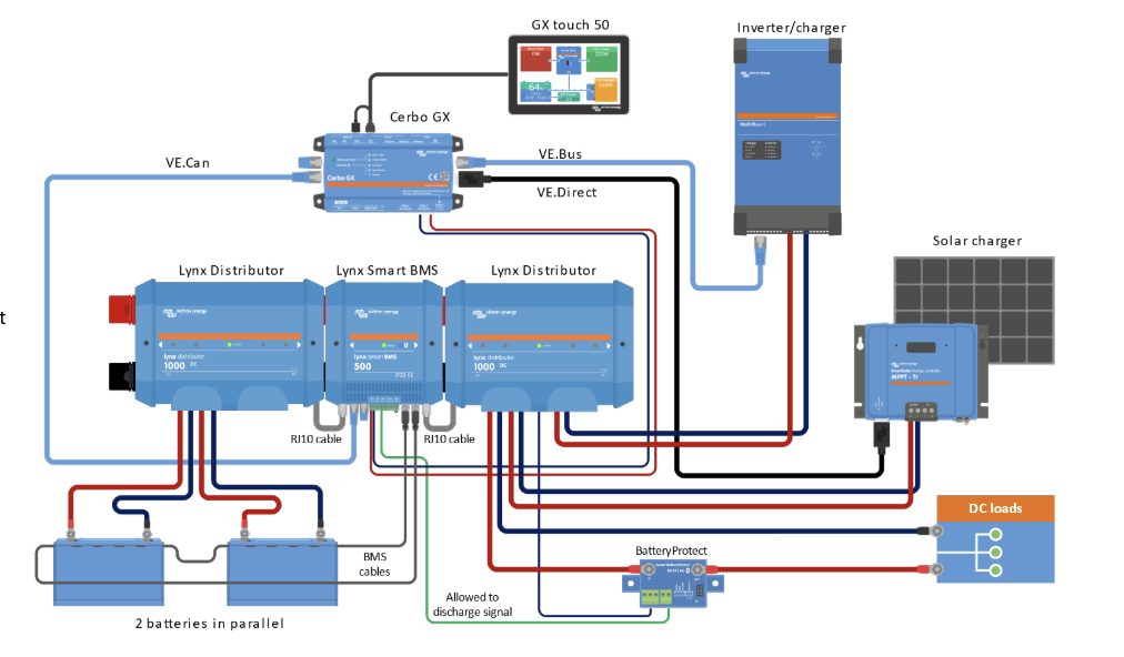 dedicato per le batterie Lithium Battery Smart di Victron che sono batterie al Litio Ferro Fosfato (LiFePo4) disponibili nelle versioni da 12,8 V o 25,6 V con svariate capacità. Possono essere collegate in serie, in parallelo e in serie/parallelo, pertanto è possibile costruire un banco batterie per tensioni di sistema da 12 V, 24 V o 48 V. Il numero massimo di batterie di un sistema è 20, che si traduce in un accumulo massimo di energia di 84 kWh in un sistema da 12 V e fino a 102 kWh nei sistemi da 24 V1) e 48 V1). Per ulteriori informazioni su queste batterie, vedere la pagina prodotto delle batterie Lithium Battery Smart di Victron.