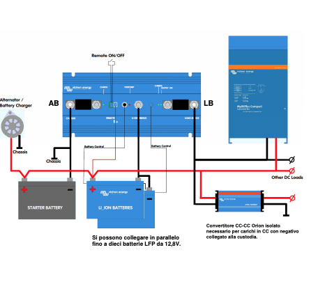 b. proteggere l’alternatore contro i sovraccarichi in caso di un banco di batterie LFP ad alta capacità (la maggior parte degli alternatori da 12V si surriscalda e va in guasto se lavora alla massima uscita per più di 15 minuti).